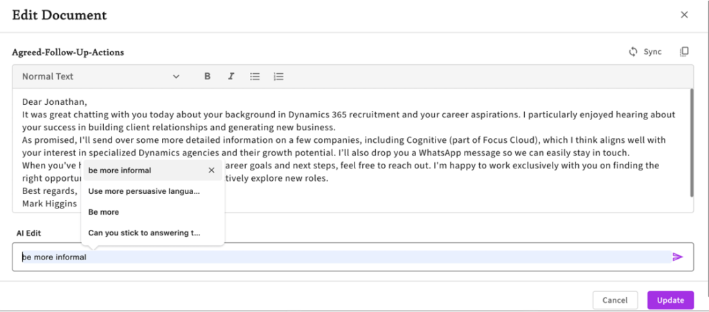 Quil will create the email for you based on each conversation and you can use the AI assist to change the tone to be more/less informal etc.